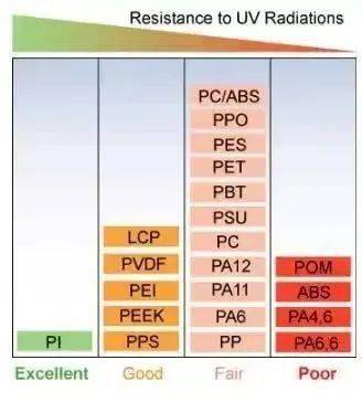 下圖比較了常用的替代金屬的聚合物的耐紫外輻射性能。