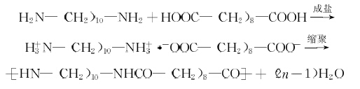 鹽再經縮聚反應制得PA1010。縮聚反應有連續縮聚和間歇縮聚兩種工藝,目前大多數生產廠采用釜式間歇縮聚T 藝,其特點是設備簡單,操作方便,聚合體的粘度易于控制。反應式如下: