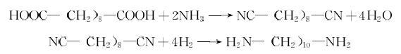 癸二胺的制法:將熔融的癸二酸與氨氣以氣液相進行氨化脫水反應,生成癸二腈。反應需在高溫下進行,最高溫度為340V。癸二腈以乙醇為溶劑,雷尼鎳為催化劑,氫氧化鉀為助催化劑,在80?110°C 反應溫度和2. 5MPa 壓力下,進行加氫反應而制得癸二胺。反應式如下: